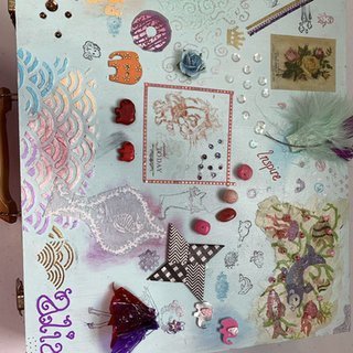 Some time ago I found an old box which had been for a canteen of cutlery it was badly stained and the fabric inside was torn and in places missing so I cleaned it all up and painted it and decorated it. Alia likes the box and wanted to make her own, fortunately my husband had sabes a box my daughter threw out at some point it had been a box of art materials for older children teens etc